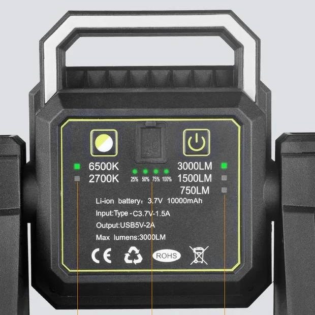 پروژکتور حرفه ای پایه دار با قابلیت نور دهی خیلی بالا multifunctional work light یکی از بهترین گزینههای روشنایی برای محیطهای بزرگ و تاریک مانند کمپینگ، مسافرتهای دستهجمعی و حتی استفاده در باغ یا فضای باز است. این محصول با برد نور 60 متری و شدت روشنایی حداکثر 3000 لومن، قادر است. در هر شرایطی نور کافی را فراهم کند که می توانید. بسته به نیاز حالت نوردهی را بین 3000، 1500، 750 لومن یا نور قرمز قابل تغییر است.