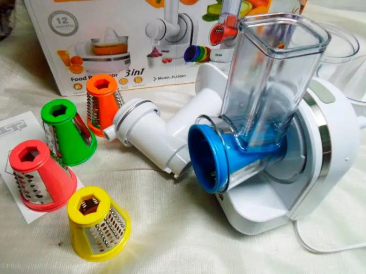 برش ضخیم، برش نازک، خردکن، تهیه دسر، تهیه اسموتی و آب پرتقال گیر دارای 5 عدد تیغه سالادساز با برش های مختلف